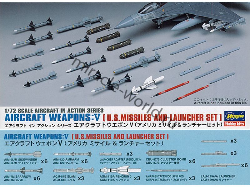 Дополнение для сборных моделей авиации, американские ракеты и узлы внешней подвески U.S. Missiles & Launcher Set в масштабе 1/72 от фирмы Hasegawa (артикул 35009).