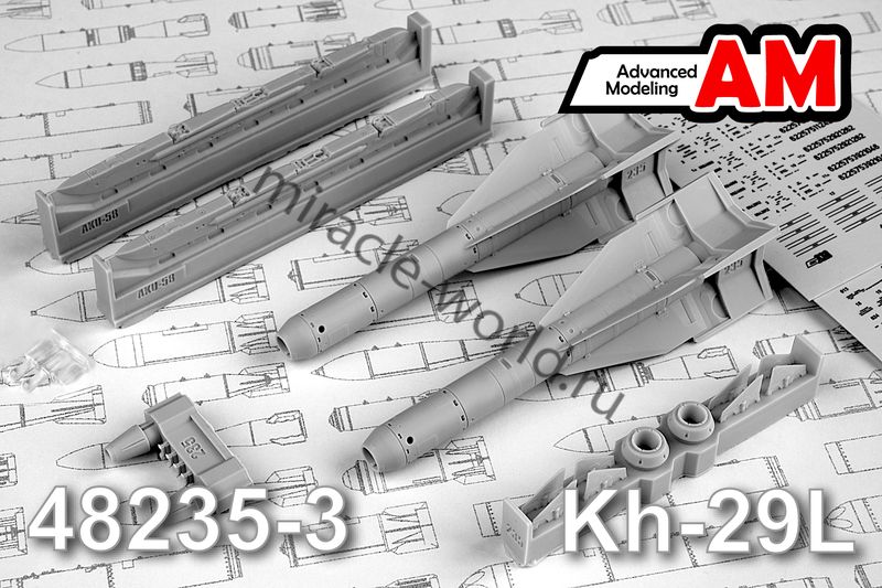 Дополнение для сборных моделей советской / российской авиации (ВКС) Х-29Л Авиационная управляемая ракета класса «Воздух-поверхность» c авиационным катапультным устройством АКУ-58 (2шт. в наборе + пусковые установки + фототравление + декали) в масштабе 1/48 от фирмы Advanced Modeling (артикул 48235-3).