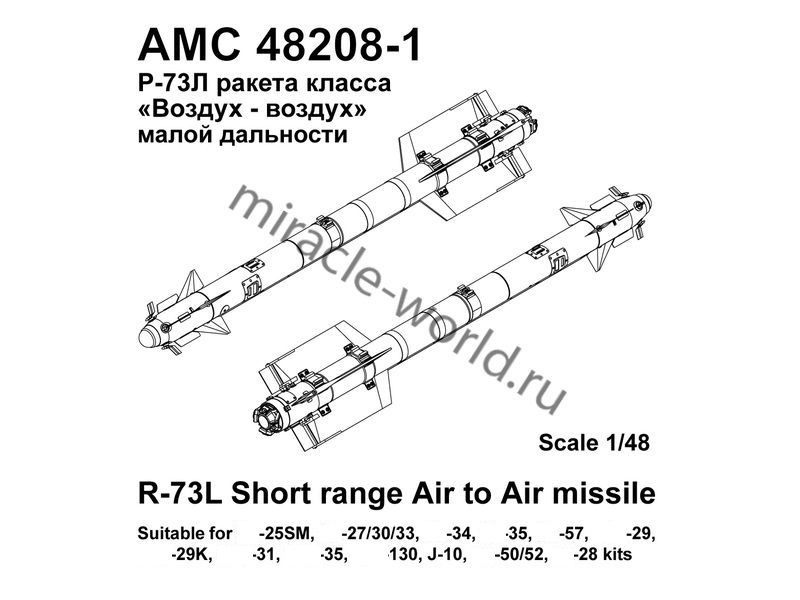 Дополнение для сборных моделей советской / российской авиации (ВКС) Р-73Л авиационная управляемая ракета малой дальности класса «Воздух-воздух» (2шт. в наборе + фототравление + декаль) в масштабе 1/48 от фирмы Advanced Modeling (артикул 48208-1).