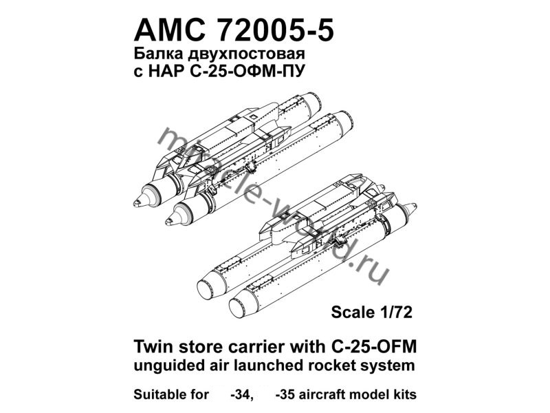 Дополнение для сборных моделей советской / российской авиации (ВКС) Двухпостовый балочный держатель с БД3-УСК с НАР С-25-ОФМ (2шт. двухпостовых БД и 4шт. блока НАР в наборе + декали) в масштабе 1/72 от фирмы Advanced Modeling (артикул 72005-5).