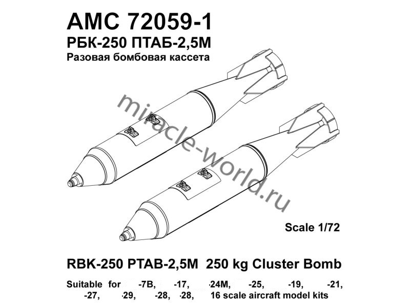 Дополнение для сборных моделей советской / российской авиации (ВКС) РБК-250 ПТАБ 2,5М разовая бомбовая кассета калибра 250 кг в снаряжении противотанковыми кумулятивными боевыми элементами (2шт. в наборе + декаль) в масштабе 1/72 от фирмы Advanced Modeling (артикул 72059-1).