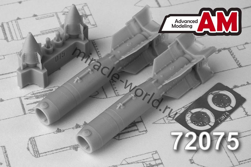 Дополнение для сборных моделей советской / российской авиации (ВКС) КАБ-500Л Корректируемая авиационная бомба калибра 500 кг с лазерной системой наведения (2шт. в наборе + фототравление + декаль) в масштабе 1/72 от фирмы Advanced Modeling (артикул 72075).