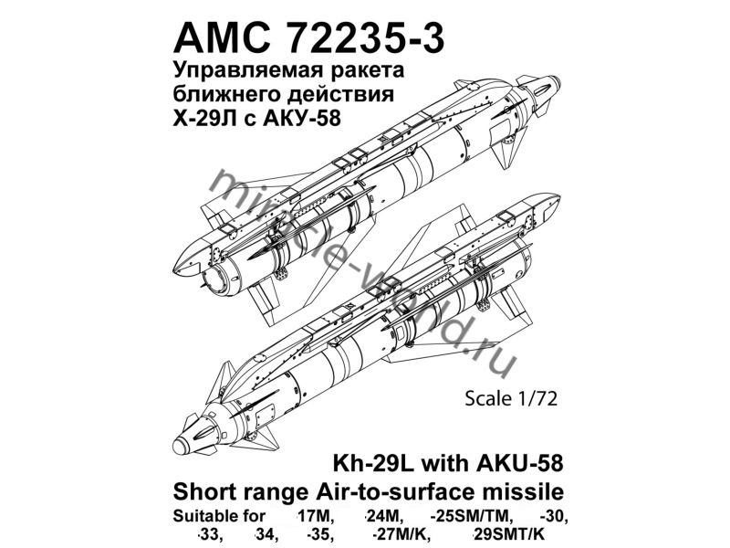 Дополнение для сборных моделей советской / российской авиации (ВКС) Х-29Л Авиационная управляемая ракета класса «Воздух-поверхность» c авиационным катапультным устройством АКУ-58 (2шт. в наборе + катапультные устройства + фототравление + декали) в масштабе 1/72 от фирмы Advanced Modeling (артикул 72235-3).