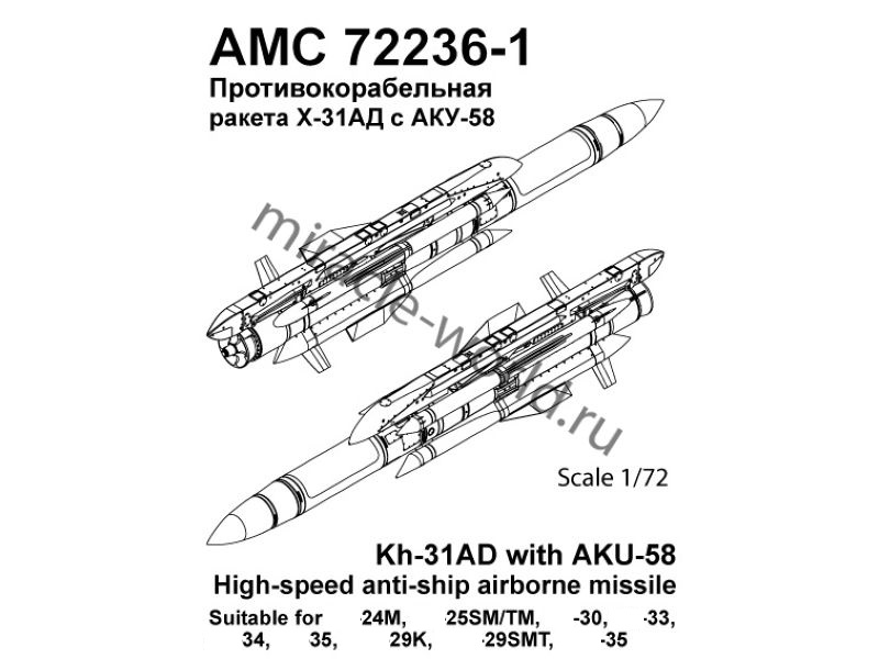 Дополнение для сборных моделей советской / российской авиации (ВКС) Х-31АД Авиационная управляемая ракета класса «Воздух-поверхность» c АКУ-58 (2шт. в наборе + пусковые устройства + декали) в масштабе 1/72 от фирмы Advanced Modeling (артикул 72236-1).
