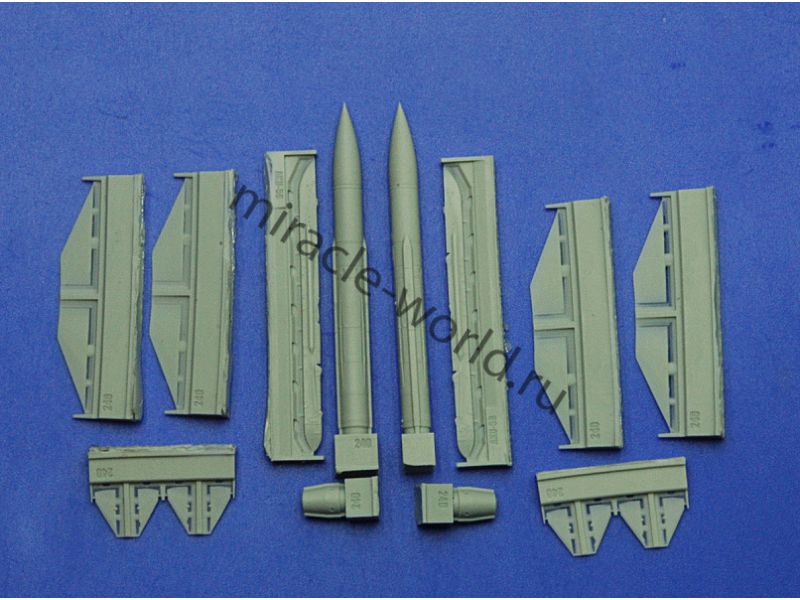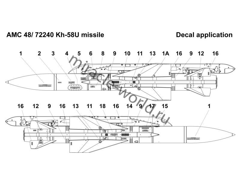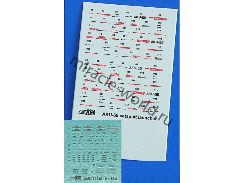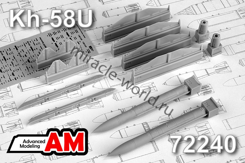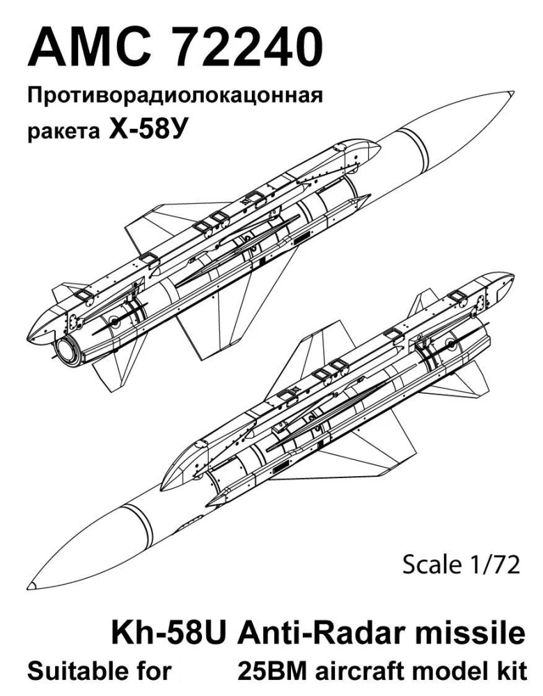 Дополнение для сборных моделей советской / российской авиации (ВКС) Х-58У Противорадиолокационная ракета c авиационным катапультным устройством АКУ-58 (2шт. в наборе + пусковые устройства + декали) в масштабе 1/72 от фирмы Advanced Modeling (артикул 72240).