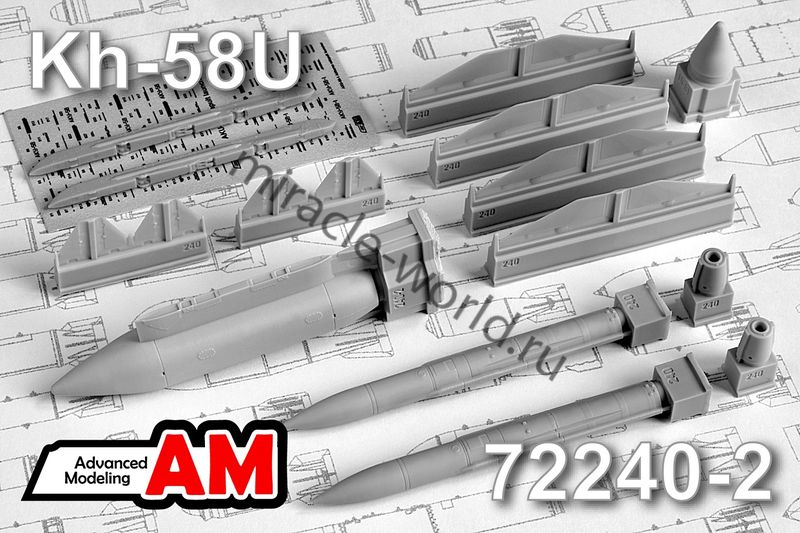 Дополнение для сборных моделей советской / российской авиации (ВКС) Х-58У Противорадиолокационная ракета c подвесной аппаратурой управления и целеуказания Л-081 "Фантасмагория-Б" (2шт. в наборе + пусковые устройства + декали) в масштабе 1/72 от фирмы Advanced Modeling (артикул 72240-2).