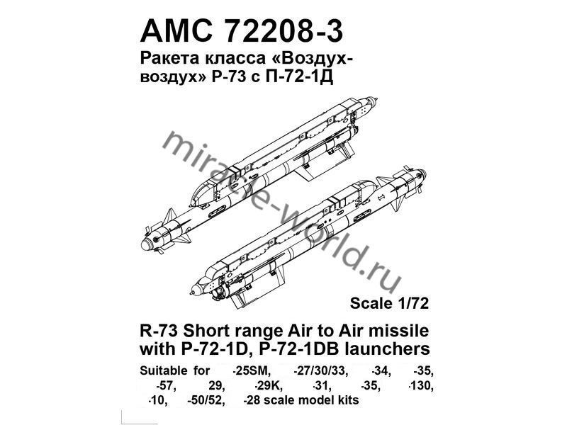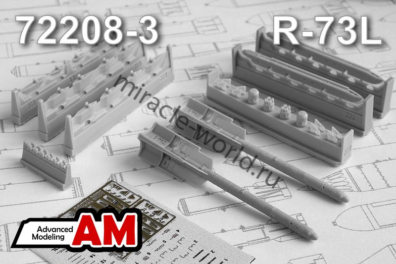 Дополнение для сборных моделей советской / российской авиации (ВКС) Р-73 авиационная управляемая ракета малой дальности класса «Воздух-воздух» с пусковой установкой П-72-1Д, П-72-1ДБ (2шт. в наборе + пусковые установки + фототравление + декаль) в масштабе 1/72 от фирмы Advanced Modeling (артикул 72208-3).