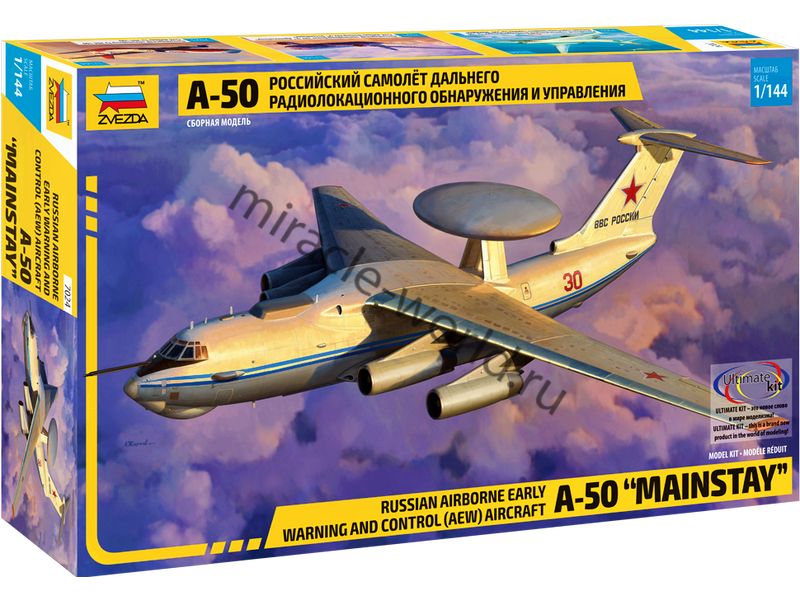 Сборная модель советского / российского самолета дальнего радиолокационного обнаружения и управления А-50 в масштабе 1/144 от фирмы Звезда / Zvezda (артикул 7024).