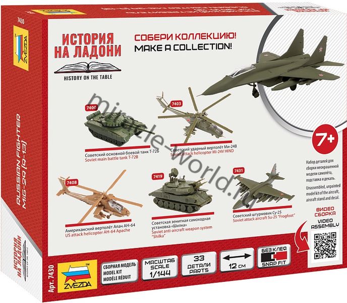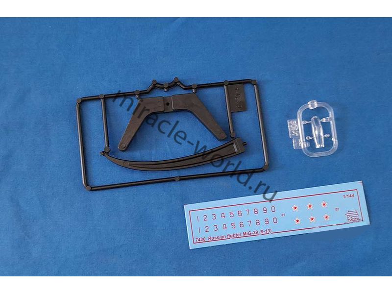 Сборная модель советского / российского многоцелевого истребителя МиГ-29 / Самолет (М) тип 29 в масштабе 1/144 от фирмы Звезда / Zvezda (артикул 7430).