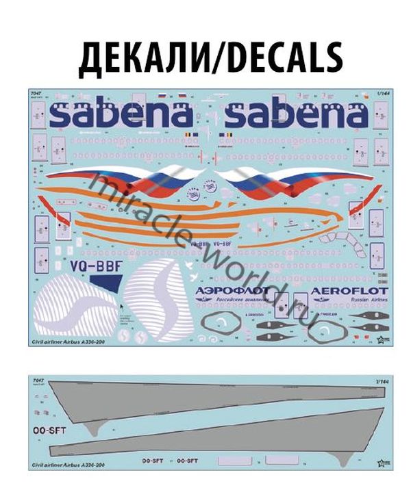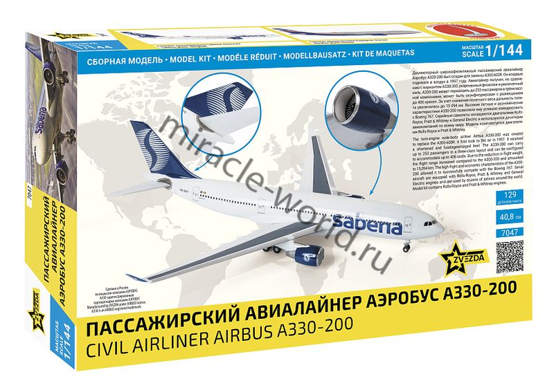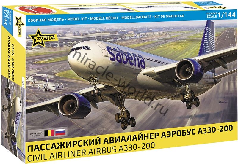 Сборная модель европейского пассажирского авиалайнера Airbus А330-200 в масштабе 1/144 от фирмы Звезда / Zvezda (артикул 7047).