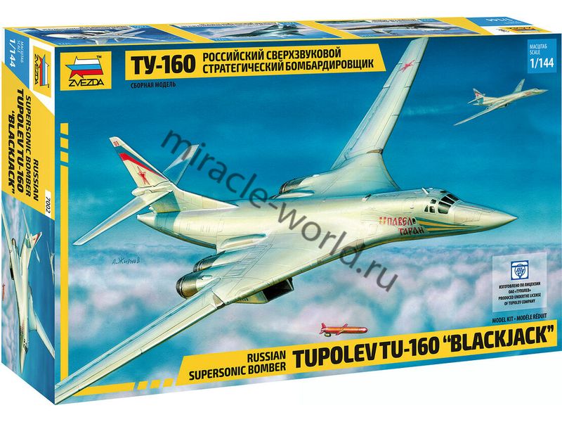 Сборная модель советского / российского стратегического бомбардировщика-ракетоносца Ту-160 в масштабе 1/144 от фирмы Звезда / Zvezda (артикул 7002).