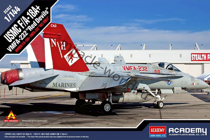 Сборная модель американского палубного истребителя - бомбардировщика McDonnell Douglas F/A-18A+ "Hornet" / F-18A+ VMFA-232 "Red Devils" в масштабе 1/144 от фирмы Academy (артикул 12627).