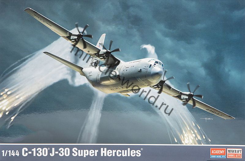 Сборная модель американского многоцелевого военно - транспортный самолета Lockheed C-130J-30 "Super Hercules" в масштабе 1/144 от фирмы Academy (артикул 12631).