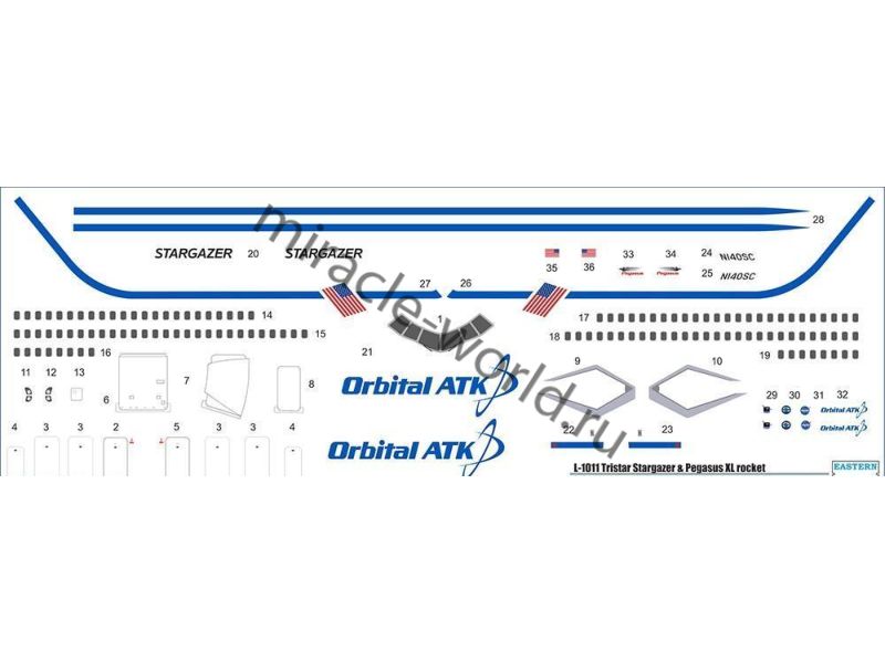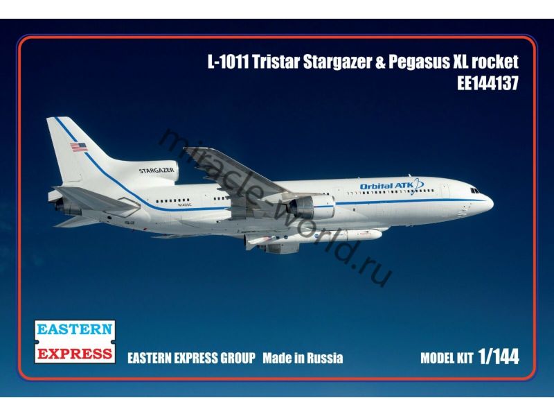 Сборная модель американского модифицированного самолета Lockheed L-1011 TriStar, используемый Orbital Sciences Corporation (OSC) как корабль-носитель и стартовая площадка для ракеты-носителя «Пегас» Stargazer на базе Lockheed L-1011 TriStar + Pegasus-XL в масштабе 1/144 от фирмы Восточный Экспресс / Eastern Express (артикул 144137).