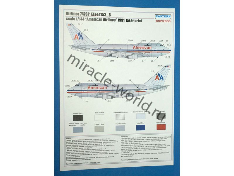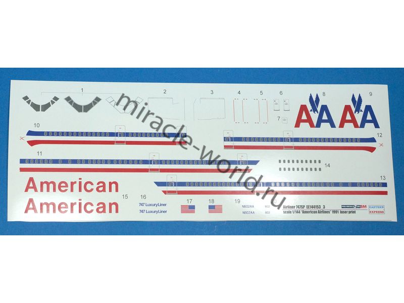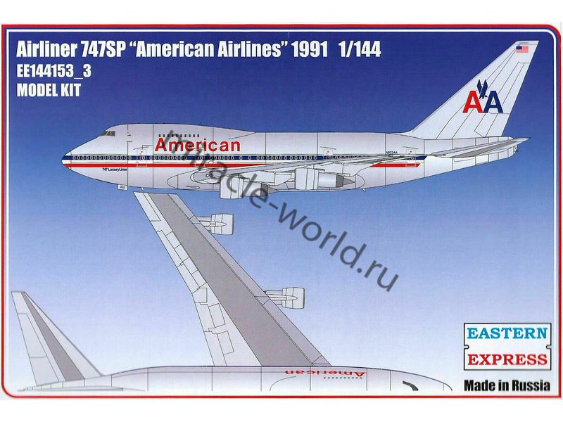 Сборная модель американского пассажирского самолета Boeing 747 SP "American Airlines" в масштабе 1/144 от фирмы Восточный Экспресс / Eastern Express (артикул 144153-3).