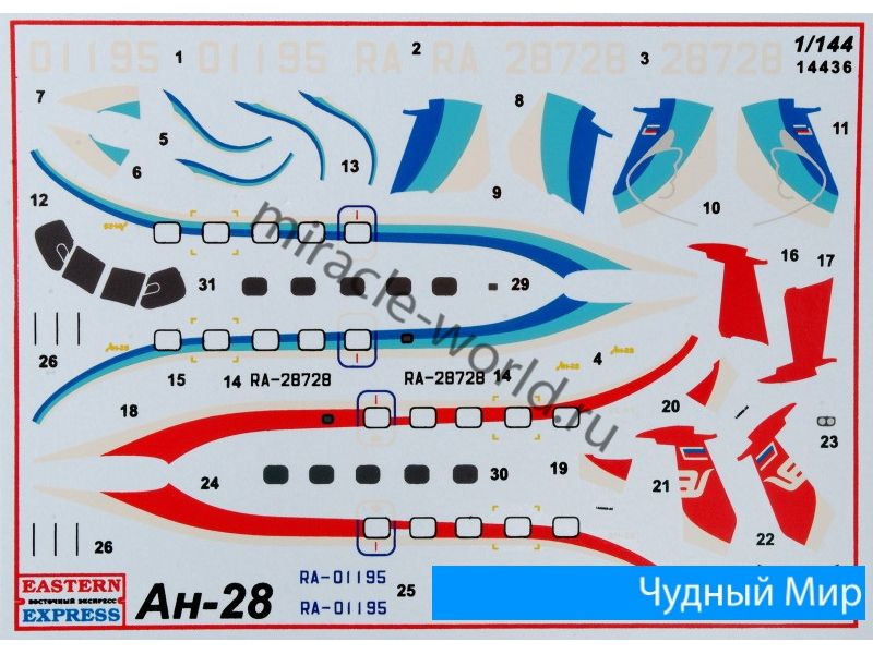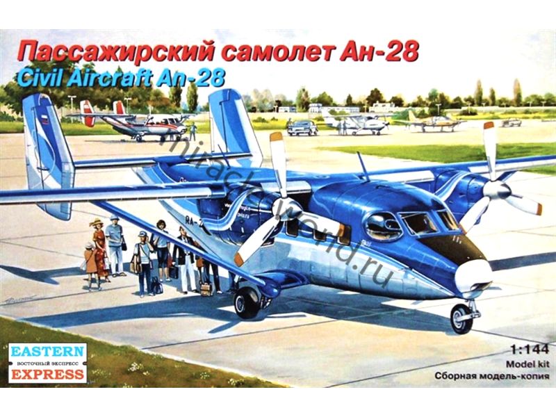 Сборная модель советского легкого многоцелевого самолета Ан-28 "Регион Авиа" в масштабе 1/144 от фирмы Восточный Экспресс / Eastern Express (артикул 14436).