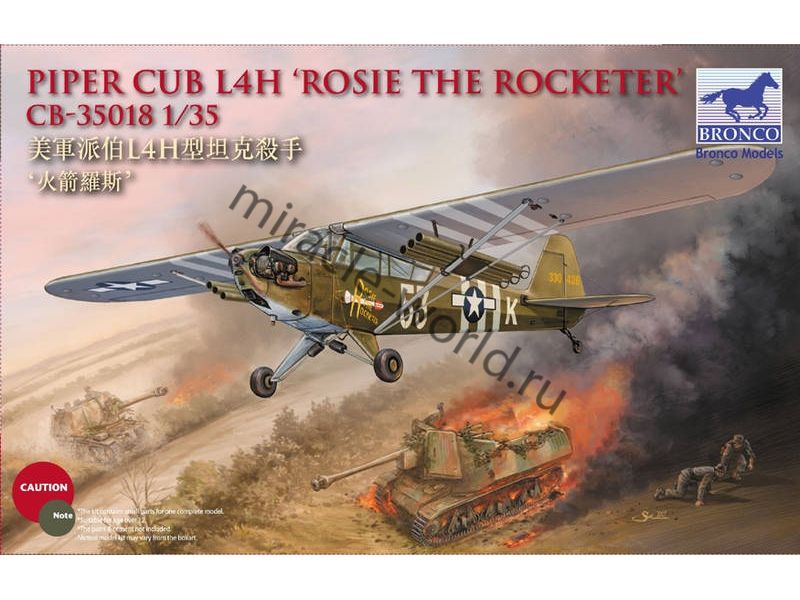 Сборная модель американского легкого штурмовика Piper L-4H / L4H "Grasshopper" / “Rosie The Rocketeer” в масштабе 1/35 от фирмы Bronco Models (артикул CB35018).