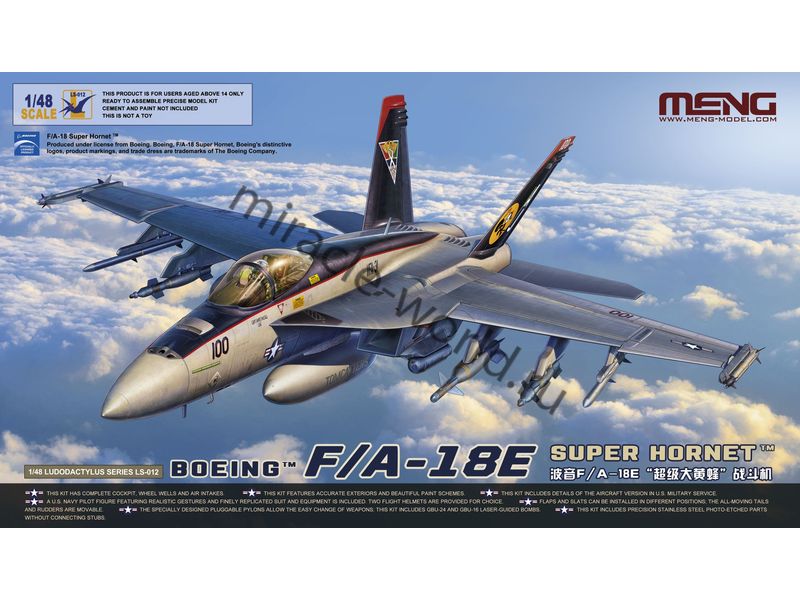 Сборная модель американского истребителя - бомбардировщика McDonnell Douglas F/A-18E "Super Hornet" / F-18E в масштабе 1/48 от фирмы Meng Model (артикул LS-012).