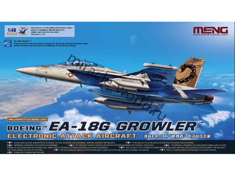 Сборная модель американского самолета радиоэлектронной борьбы Boeing EA-18G "Growler" / F-18G в масштабе 1/48 от фирмы Meng (артикул LS-014).