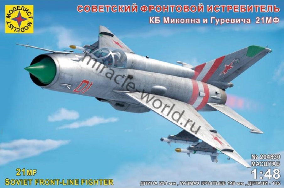 Сборная модель советского истребителя - перехватчика Самолет (М) тип 21МФ в масштабе 1/48 от фирмы Моделист (артикул 204830).