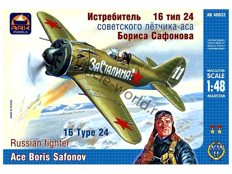 Сборная модель истребителя И-16 тип 24 "Бориса Сафонова" + 3D фигура пилота в масштабе 1/48 от фирмы ARK Models (артикул 48033f).