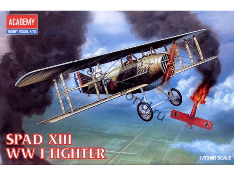 Сборная модель французского легкого одноместного истребителя времен Первой мировой войны Spad S.XIII в масштабе 1/72 от фирмы Academy (артикул 12446).
