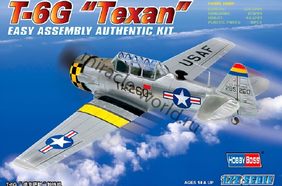 Сборная модель американского учебно - тренировочного самолета North American T-6G "Texan" в масштабе 1/72 от фирмы Hobby Boss (артикул 80233).