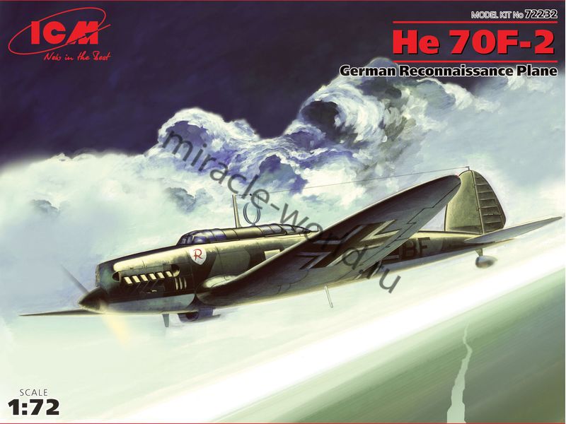 Сборная модель немецкого легкого самолета разведчика, бомбардировщика, Heinkel He-70F-2 в масштабе 1/72 от фирмы ICM (артикул 72232).