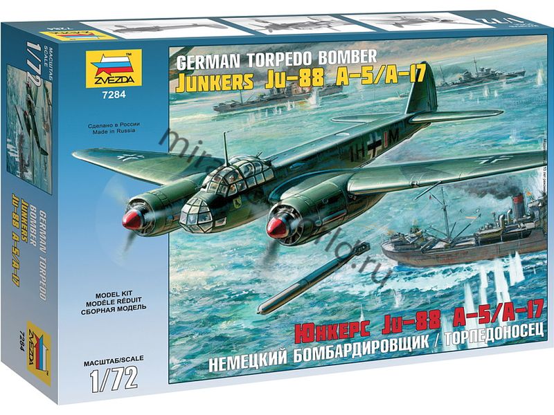 Сборная модель немецкого пикирующего бомбардировщика - торпедоносца Junkers Ju-88A-5 / Ju-88A-17 в масштабе 1/72 от фирмы Звезда / Zvezda (артикул 7284).