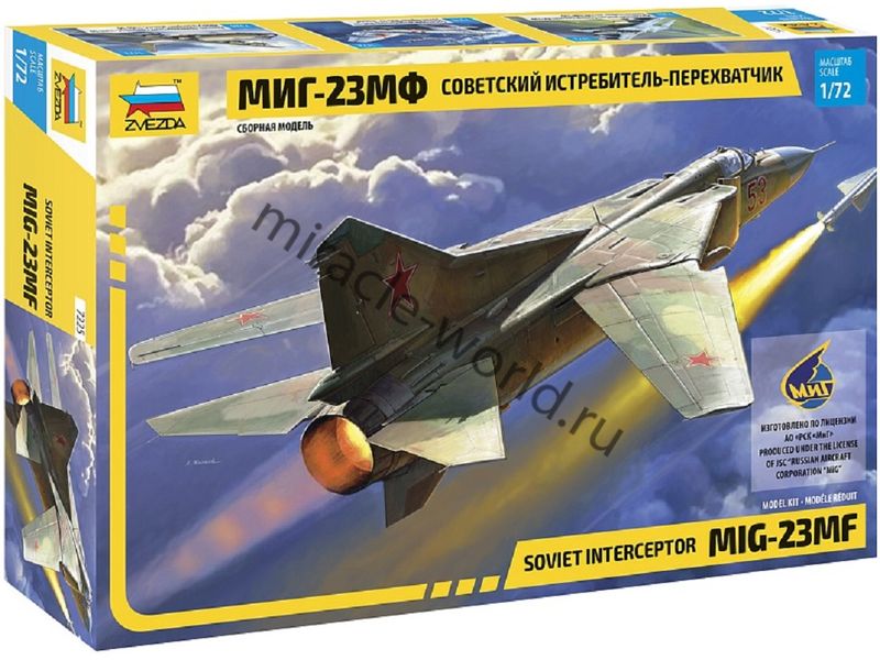 Сборная модель советского многоцелевого истребителя МиГ-23МФ в масштабе 1/72 от фирмы Звезда / Zvezda (артикул 7225).