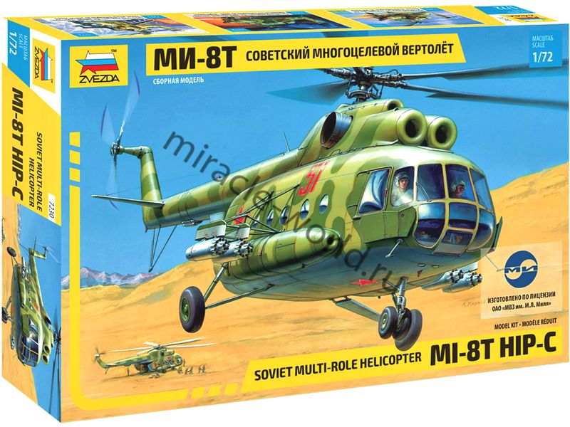Сборная модель советского / российского многоцелевого транспортного вертолета Ми-8Т в масштабе 1/72 от фирмы Звезда / Zvezda (артикул 7230).