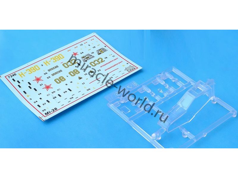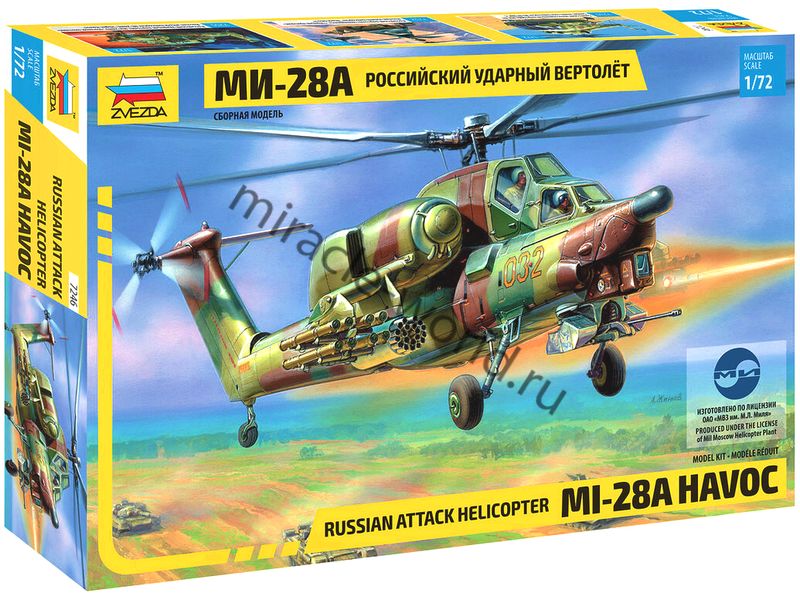 Сборная модель советского / российского многоцелевого ударного вертолета Ми-28А / Вертолет (М) тип 28А в масштабе 1/72 от фирмы Звезда / Zvezda (артикул 7246).