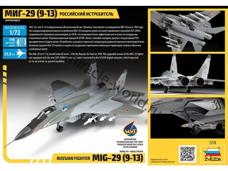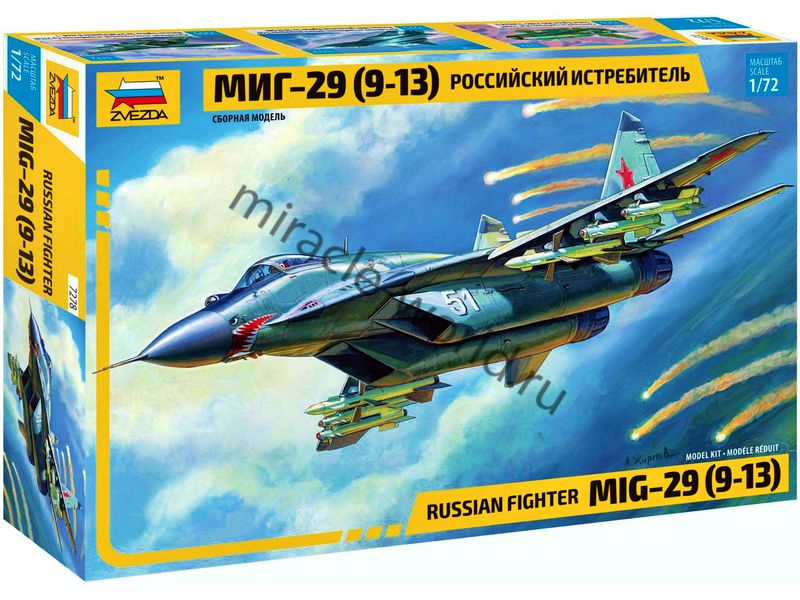 Сборная модель советского / российского фронтового истребителя МиГ-29 "9-13" в масштабе 1/72 от фирмы Звезда / Zvezda (артикул 7278).