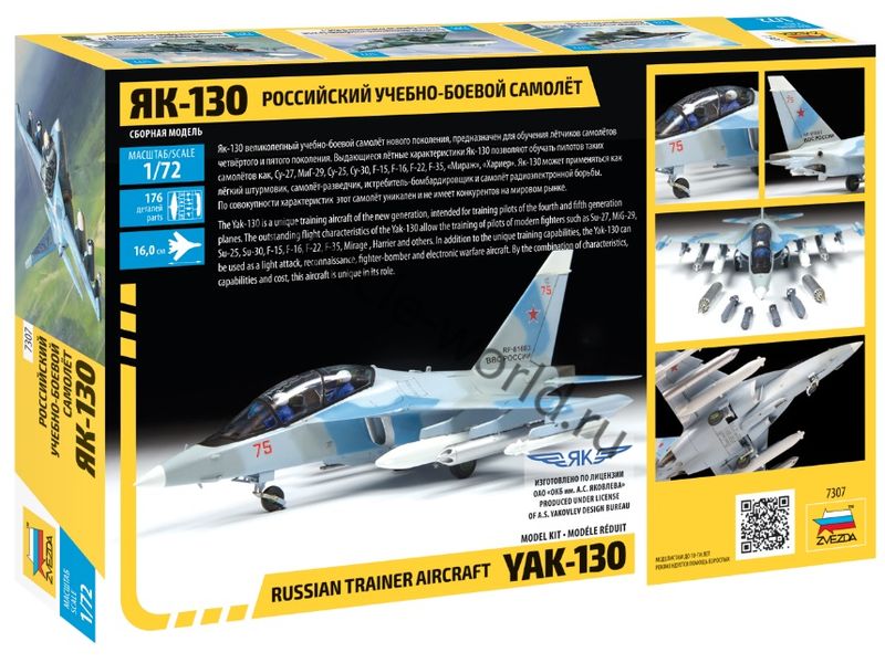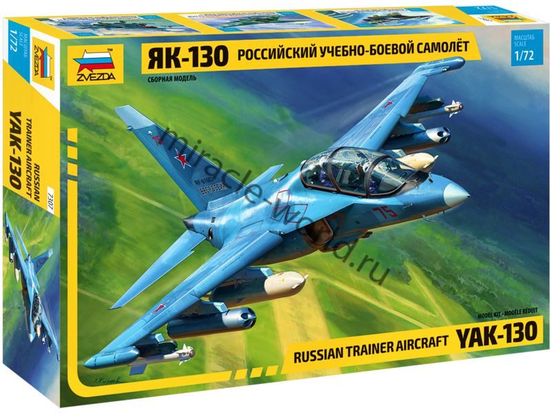 Сборная модель российского учебно-боевого самолета, легкого штурмовика - бомбардировщика Як-130 в масштабе 1/72 от фирмы Звезда / Zvezda (артикул 7307).