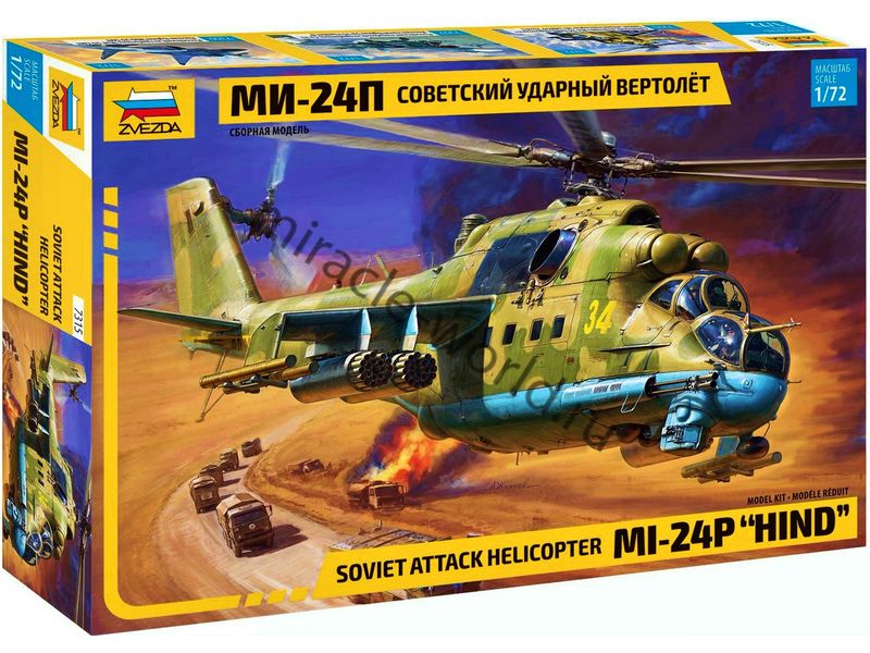 Сборная модель советского / российского многоцелевого ударно - транспортного вертолета Ми-24П в масштабе 1/72 от фирмы Звезда / Zvezda (артикул 7315).