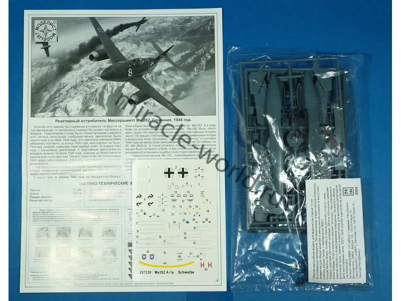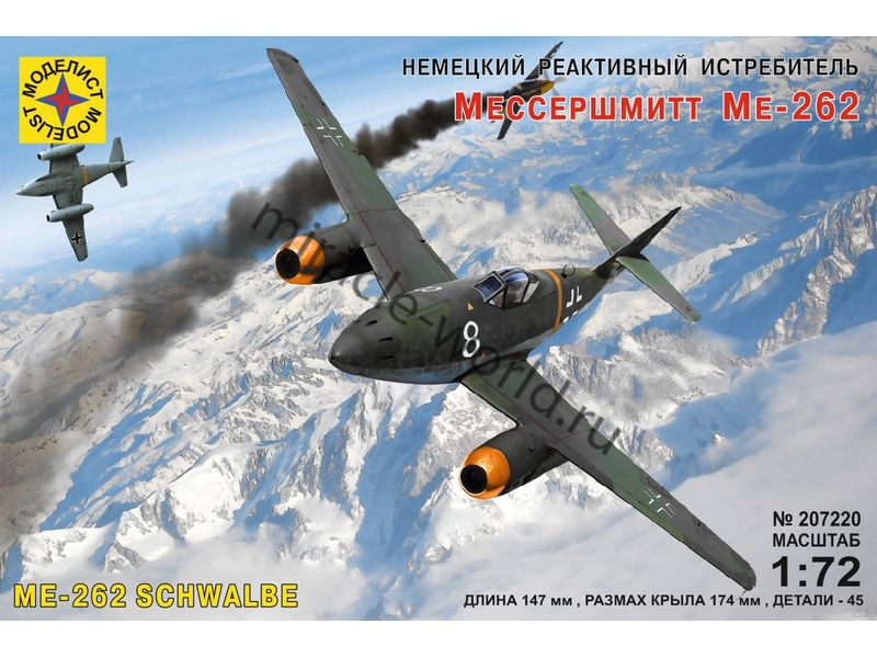 Сборная модель немецкого истребителя - перехватчика Messerschmitt Me-262A "Schwalbe" в масштабе 1/72 от фирмы Моделист (артикул 207220).