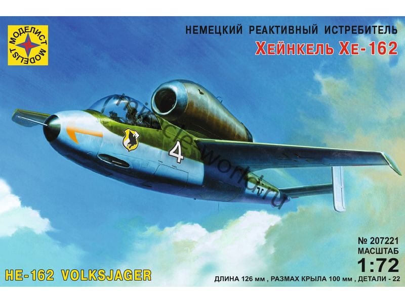 Сборная модель немецкого истребителя Heinkel He-162 "Salamander" в масштабе 1/72 от фирмы Моделист (артикул 207221).