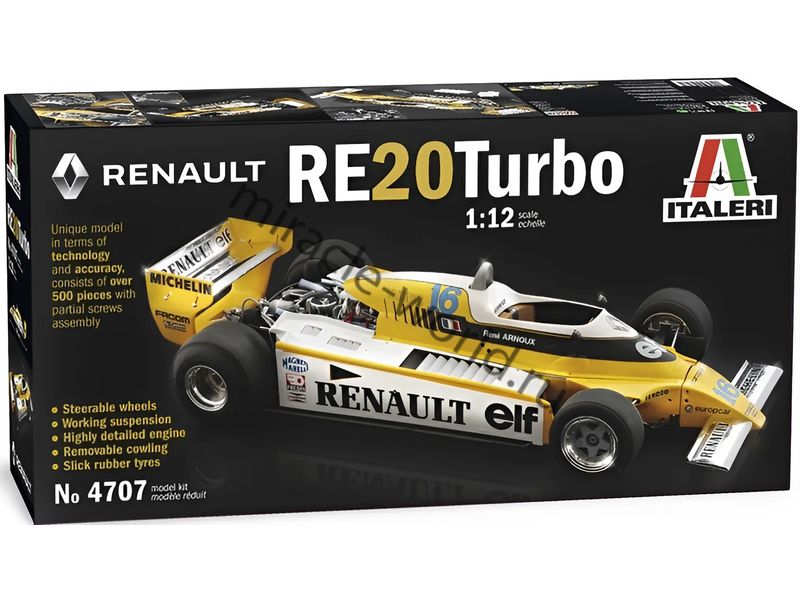 Сборная модель французского болида Формула 1 Renault RE20 Turbo F1 в масштабе 1/12 от фирмы Italeri (артикул 4707).