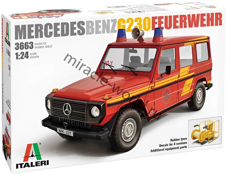 Сборная модель немецкого пожарного автомобиля Mercedes-Benz G230 "Feuerwehr" / "Fire Truck" в масштабе 1/24 от фирмы Italeri (артикул 3663).