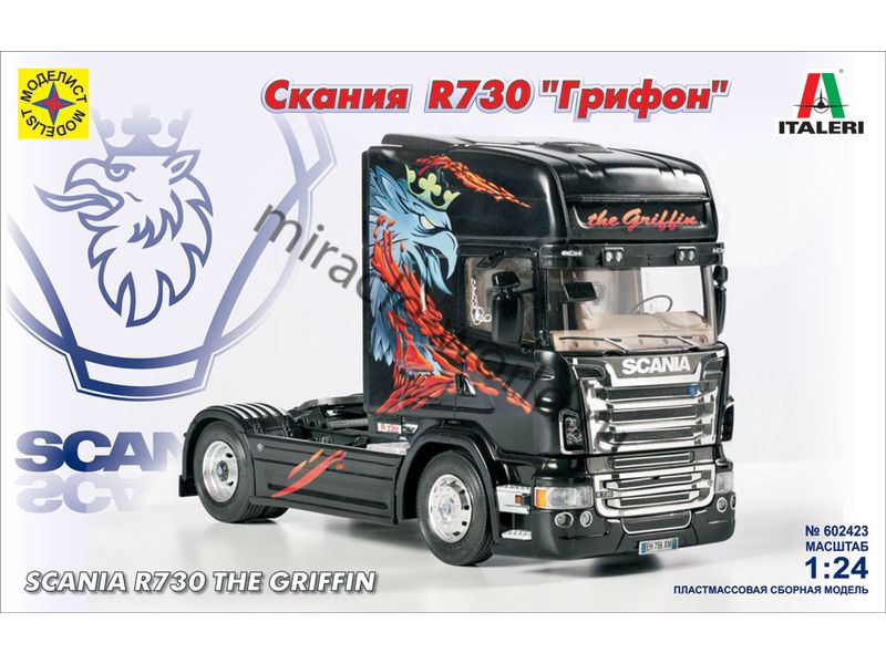 Сборная модель шведского седельного тягача Scania R730 V8 Topline "The Griffin" в масштабе 1/24 от фирмы Моделист (артикул 602423).