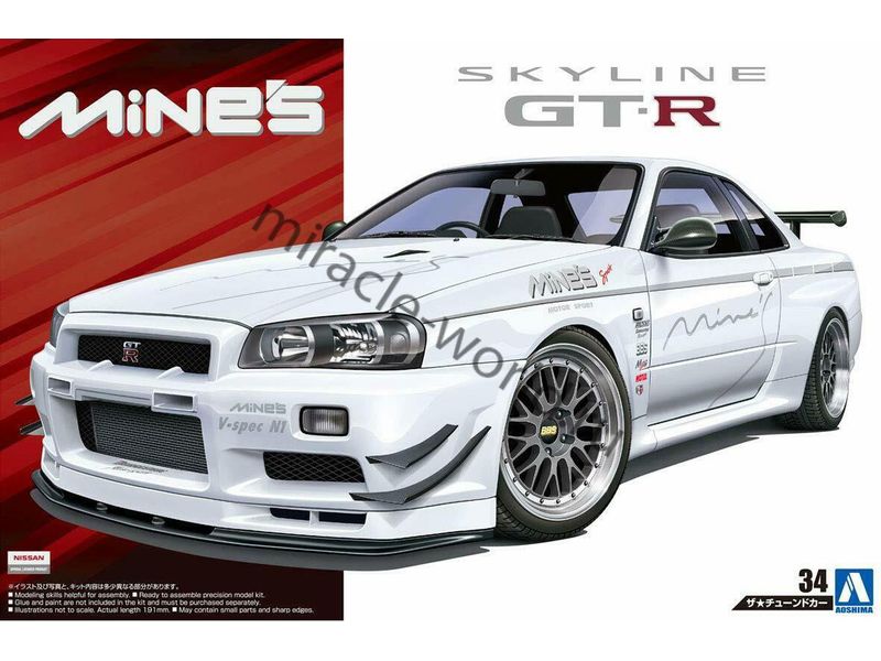 Сборная модель японского автомобиля Nissan Skyline GT-R Mine's BNR34 '02 в масштабе 1/24 от фирмы Aoshima (артикул 05986).