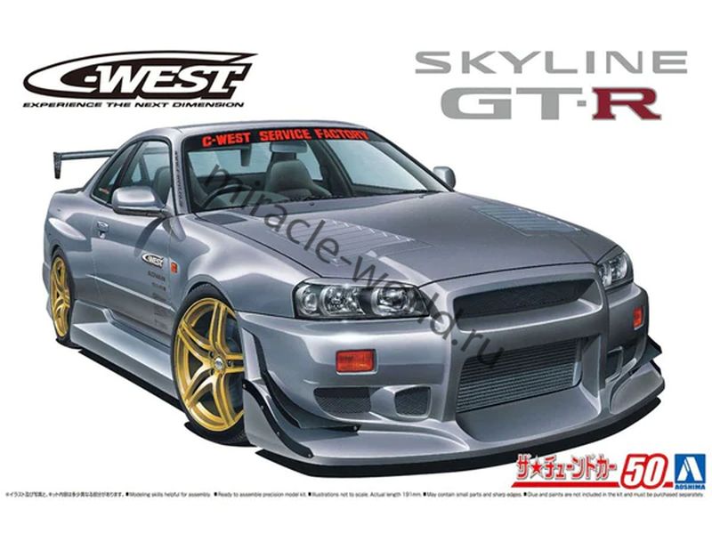 Сборная модель японского автомобиля Nissan Skyline R34 GT-R "C-West" в масштабе 1/24 от фирмы Aoshima (артикул 06149).