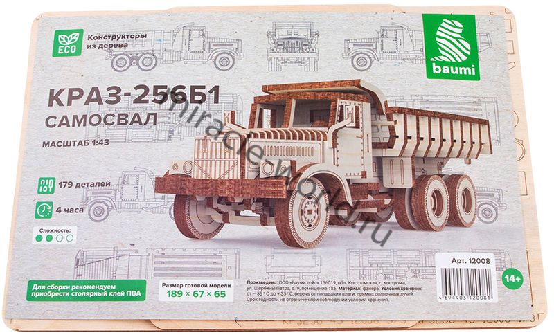 Сборная модель советского самосвала из дерева КрАЗ-256Б1 в масштабе 1/43 от фирмы Baumi (артикул 12008).