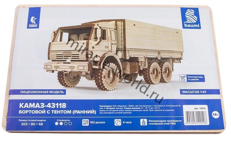 Сборная модель российского грузового автомобиля из дерева КамАЗ-43118 (бортовой с тентом) в масштабе 1/43 от фирмы Baumi (артикул 12012).