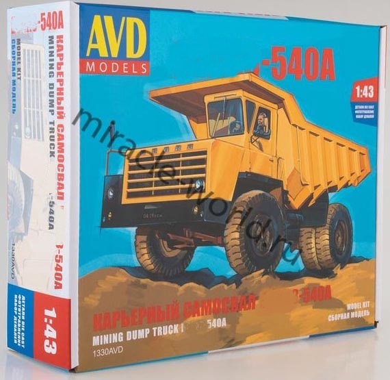 Сборная модель беларусского большегрузного самосвала Беларусский автозавод-540А в масштабе 1/43 от фирмы AVD Models (артикул 1330).