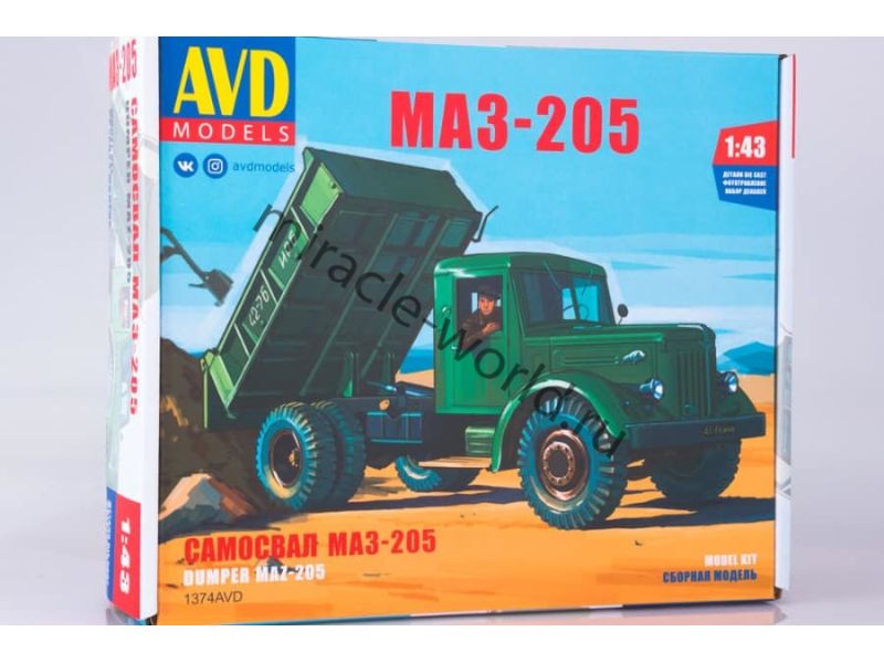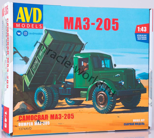 Сборная модель советского самосвала МАЗ-205 в масштабе 1/43 от фирмы AVD Models (артикул 1374).