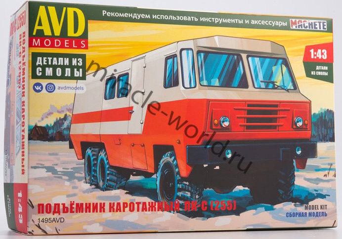 Сборная модель советского подъемника каротажного ПК-С на базе КрАЗ-255 в масштабе 1/43 от фирмы AVD Models (артикул 1495).