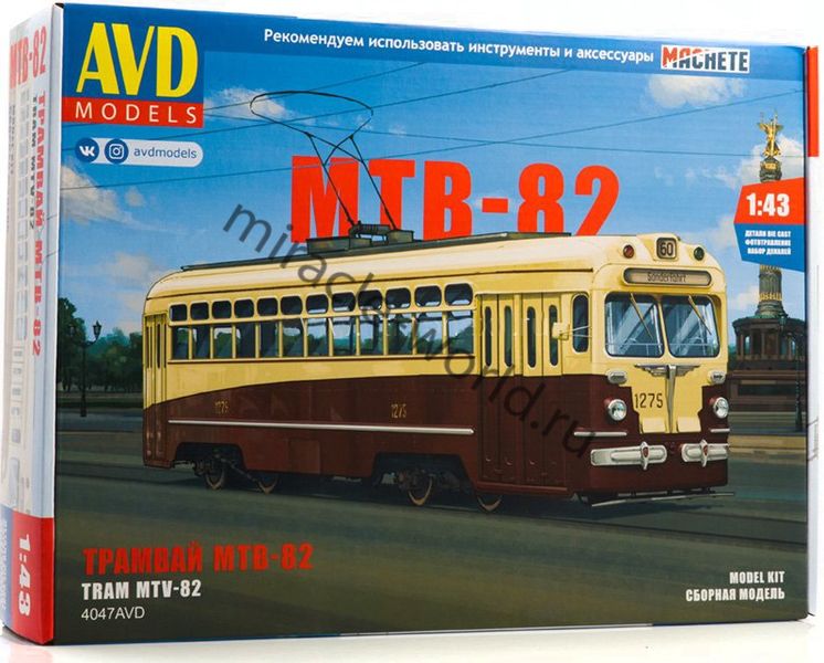 Сборная модель советского высокопольного трамвая МТВ-82 в масштабе 1/43 от фирмы AVD Models (артикул 4047).