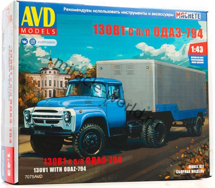 Сборная модель советского грузового автомобиля Автомобиль (З) тип 130В1 с полуприцепом ОДАЗ-794 в масштабе 1/43 от фирмы AVD Models (артикул 7075).