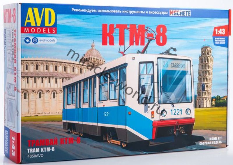 Сборная модель советского / российского высокопольного трамвая КТМ-8 в масштабе 1/43 от фирмы AVD Models (артикул 4050).